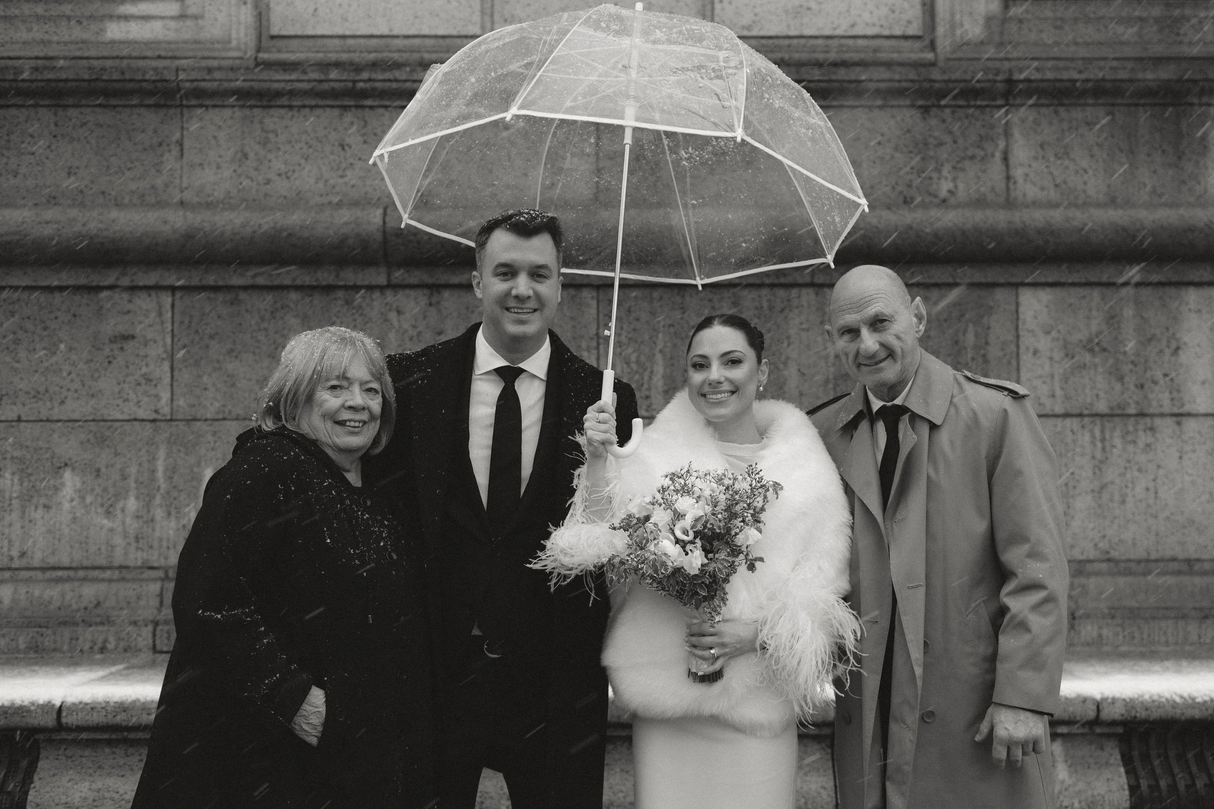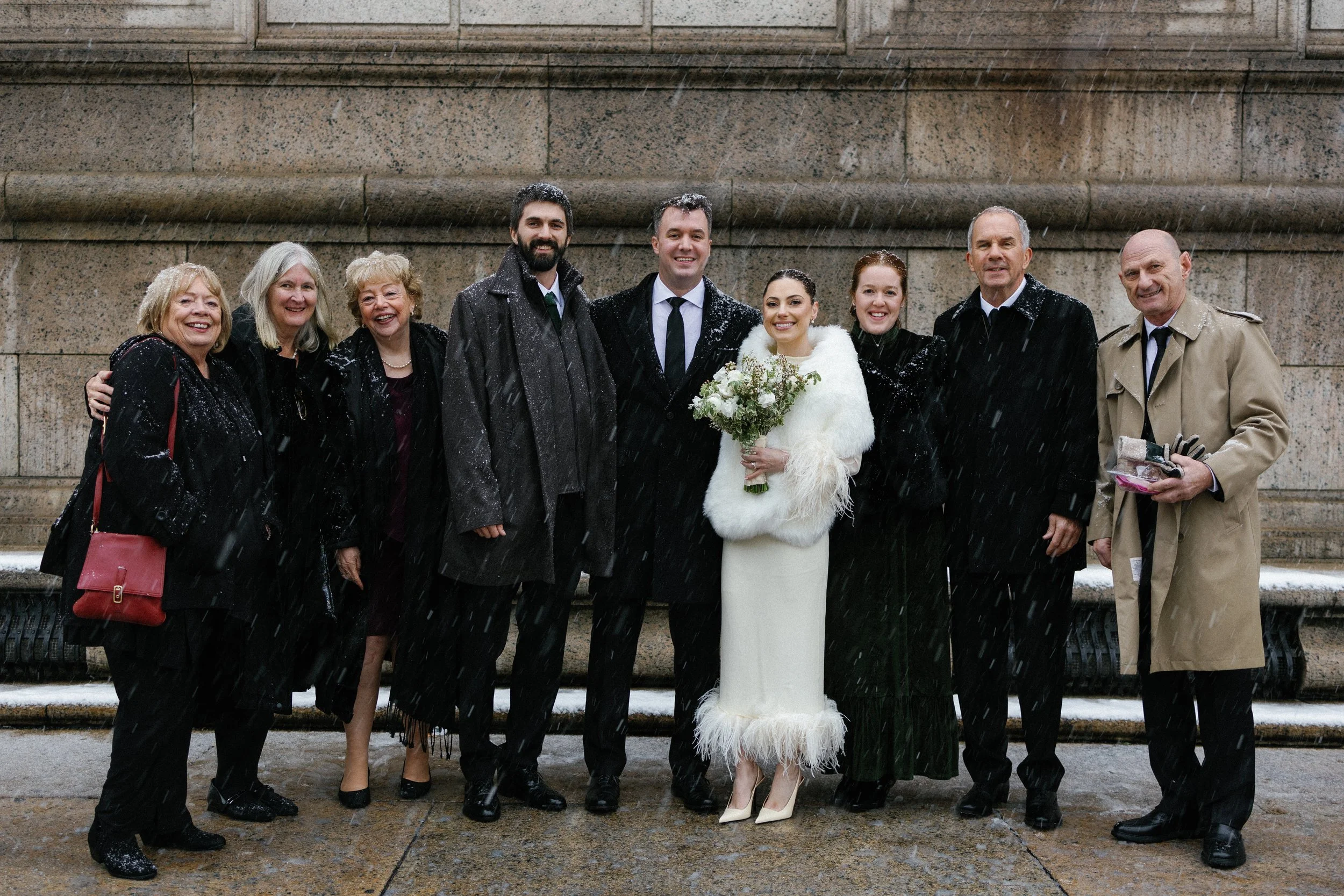 After the ceremony, we took a car for family portraits in front of the Boston Public Library. It was actively snowing and everyone huddled close together to stay warm during the photos.